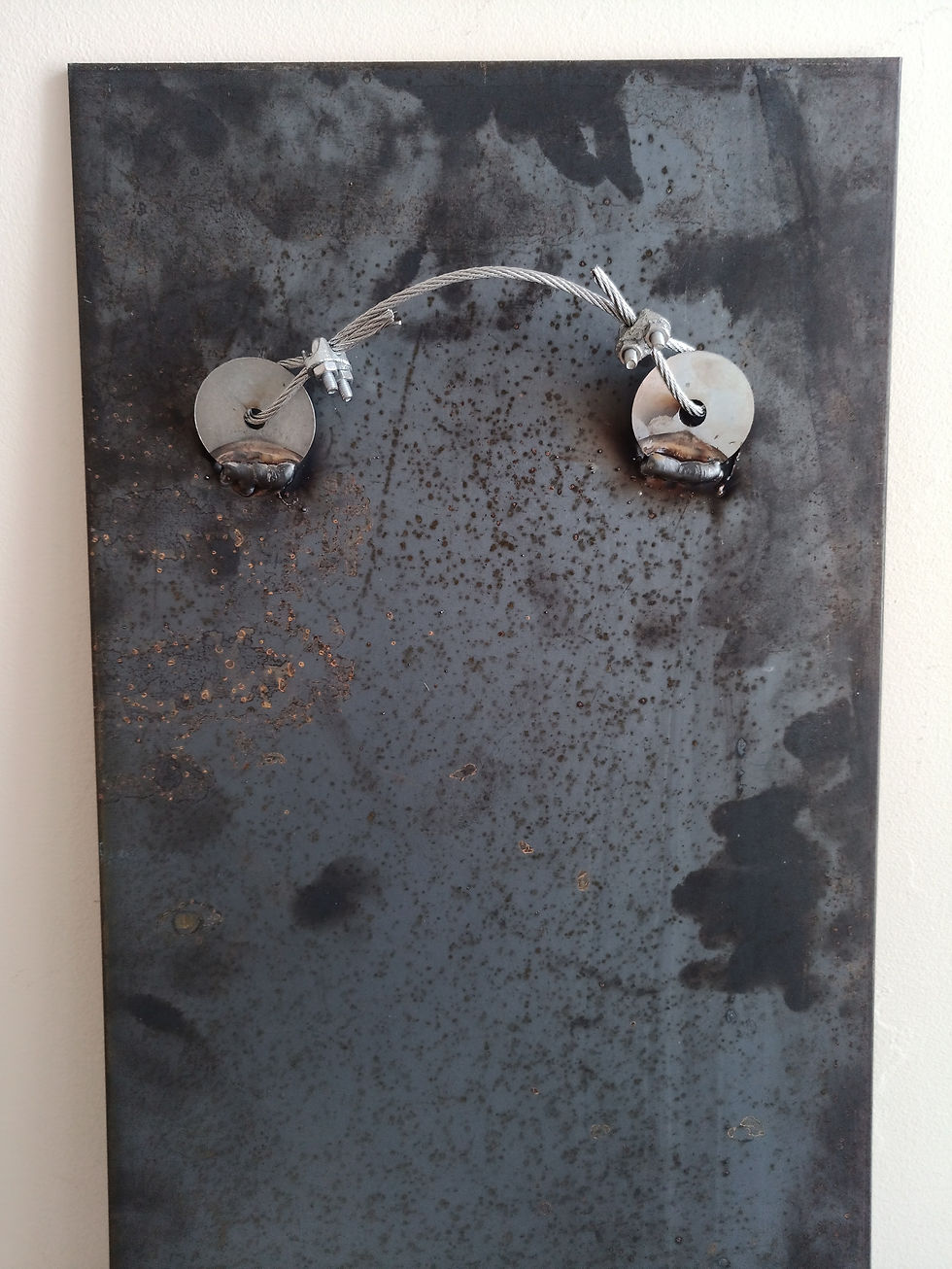 Welded washers and 3mm steel wire (7x7 construction) with bulldog grips on back. This piece will need a sturdy screw/bolt in the wall.